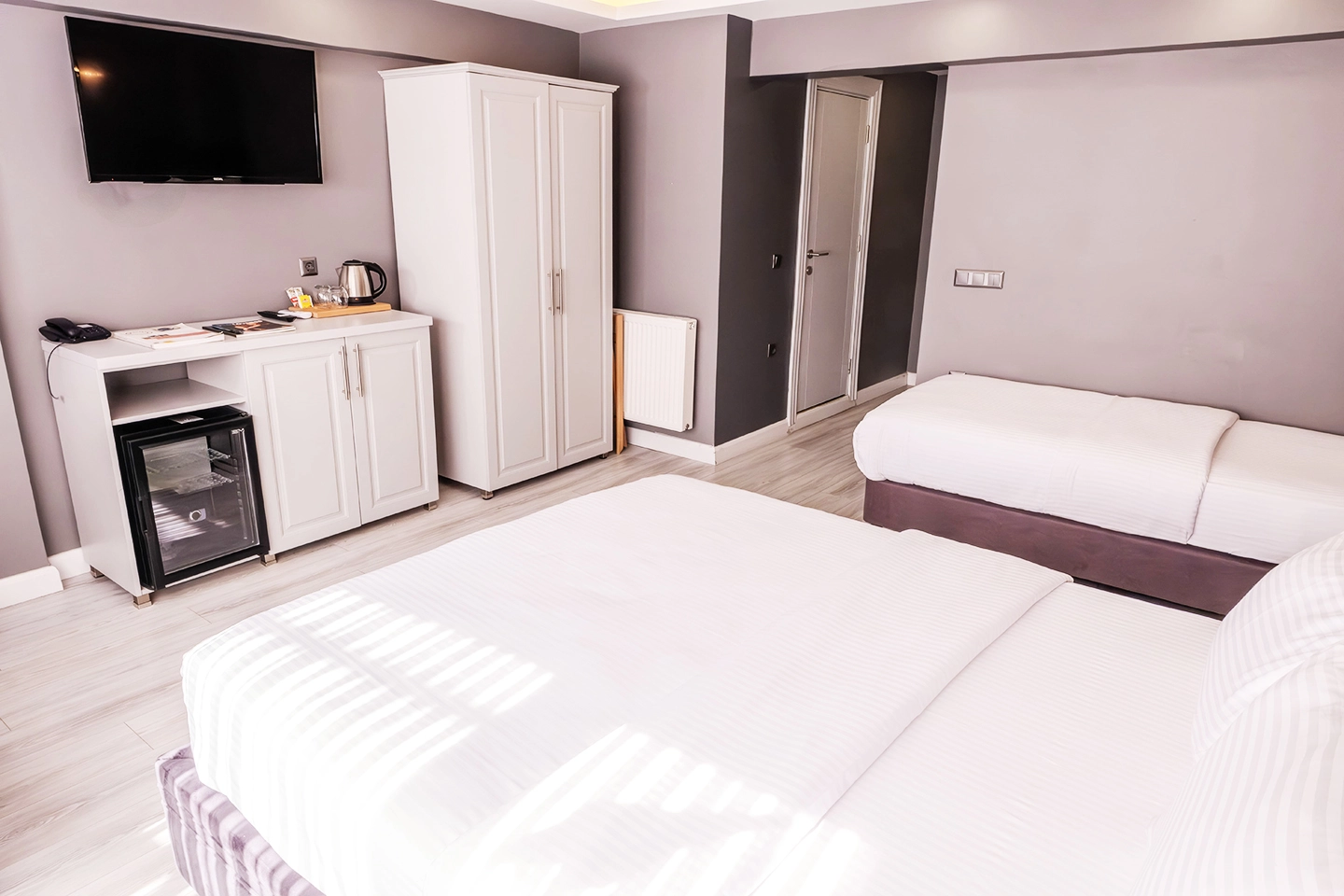 Şık tasarımı ve modern olanaklarıyla öne çıkan odamızda üç kişilik konforlu yatak düzeni, özel banyo, oturma alanı, ücretsiz Wi-Fi, klima ve Akıllı TV bulunmaktadır.